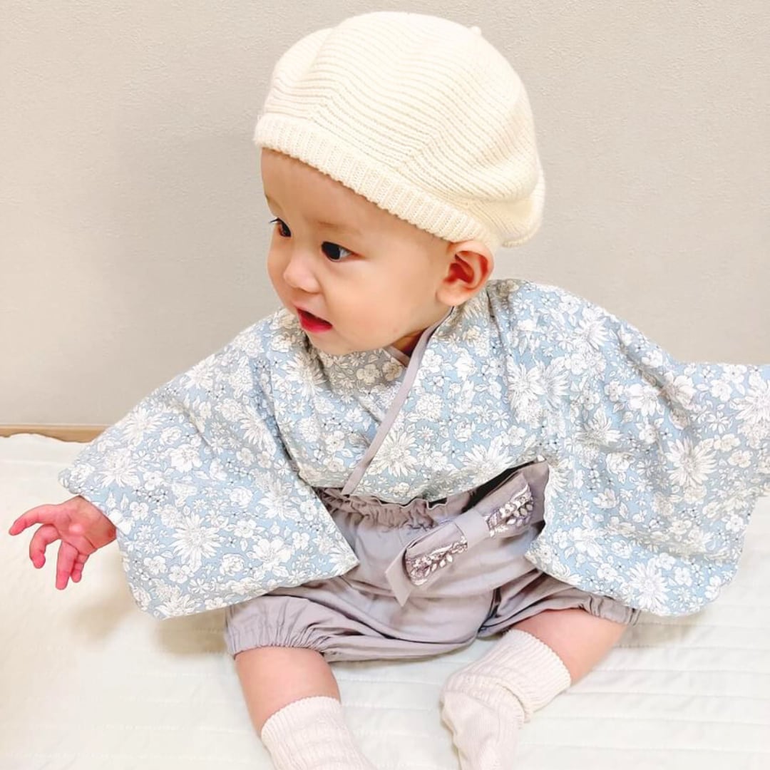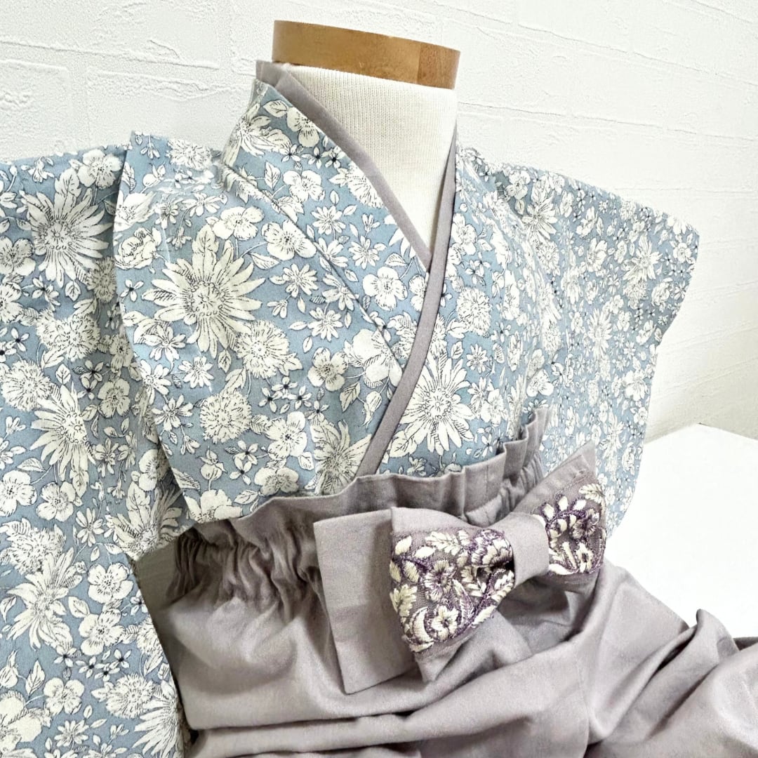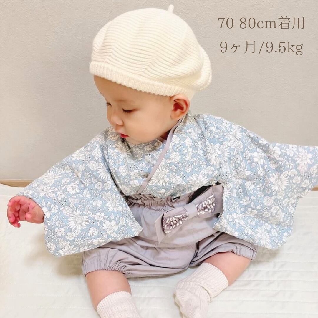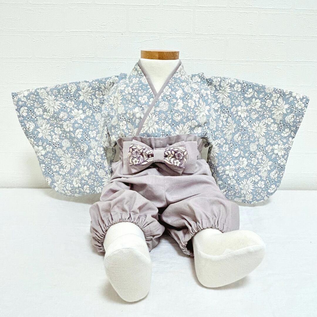 カームブルーの花柄ベビー袴 お食い初め 初節句 雛祭り こどもの日 100日祝い 出産祝い くすみカラー