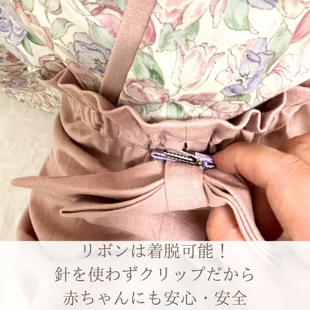 ・リボンは安全を考慮しベビー用のヘアクリップで留める仕様にしていますがお子様が指を挟んでしまわぬよう保護者様の目の届くところでご使用してください。