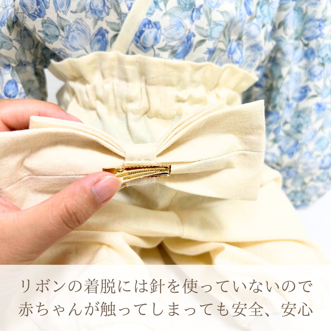 ・リボンは安全を考慮しベビー用のヘアクリップで留める仕様にしていますがお子様が指を挟んでしまわぬよう保護者様の目の届くところでご使用してください。